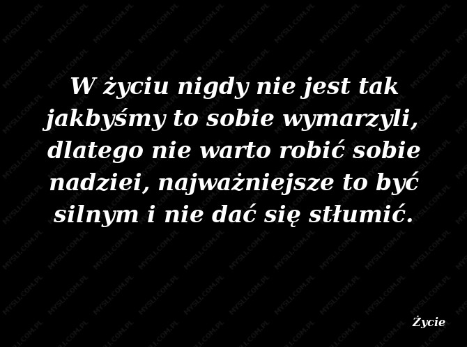 W życiu nigdy nie jest tak jakbyśmy to sobie wymarzyli, dlatego nie warto robić sobie nadziei, najważniejsze to być silnym i nie dać się stłumić.