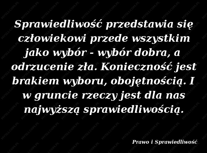 Sprawiedliwość przedstawia się człowiekowi przede wszystkim jako wybór - wybór dobra, a odrzucenie zła. Konieczność jest brakiem wyboru, obojętnością. I w gruncie rzeczy jest dla nas najwyższą sprawiedliwością.