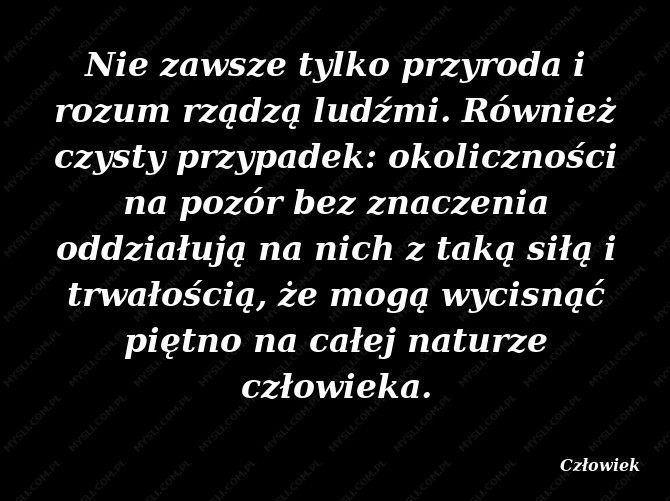 Nie zawsze tylko przyroda i rozum rządzą ludźmi. Również czysty przypadek: okoliczności na pozór bez znaczenia oddziałują na nich z taką siłą i trwałością, że mogą wycisnąć piętno na całej naturze człowieka.