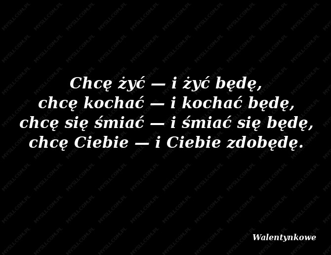 Chcę żyć — i żyć będę, chcę kochać — i kochać będę, chcę się śmiać — i śmiać się będę, chcę Ciebie — i Ciebie zdobędę.