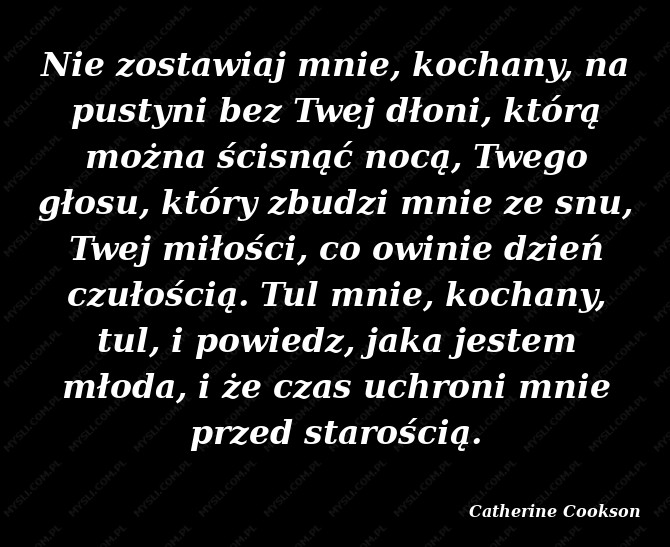 Nie zostawiaj mnie, kochany, na pustyni bez Twej dłoni, którą można ścisnąć nocą, Twego głosu, który zbudzi mnie ze snu, Twej miłości, co owinie dzień czułością. Tul mnie, kochany, tul, i powiedz, jaka jestem młoda, i że czas uchroni mnie przed starością.