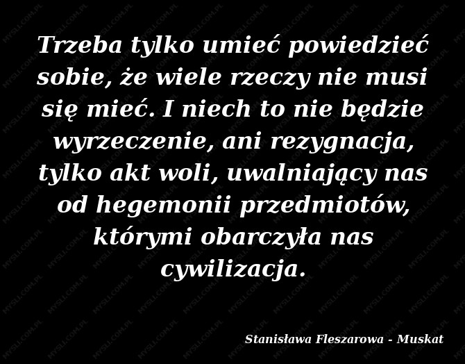 Trzeba tylko umieć powiedzieć sobie, że wiele rzeczy nie musi się mieć. I niech to nie będzie wyrzeczenie, ani rezygnacja, tylko akt woli, uwalniający nas od hegemonii przedmiotów, którymi obarczyła nas cywilizacja.