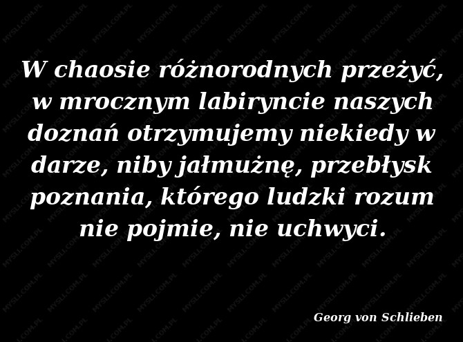 W chaosie różnorodnych przeżyć, w mrocznym labiryncie naszych doznań otrzymujemy niekiedy w darze, niby jałmużnę, przebłysk poznania, którego ludzki rozum nie pojmie, nie uchwyci.