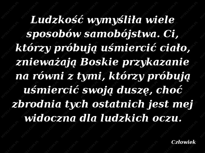 Ludzkość wymyśliła wiele sposobów samobójstwa. Ci, którzy próbują uśmiercić ciało, znieważają Boskie przykazanie na równi z tymi, którzy próbują uśmiercić swoją duszę, choć zbrodnia tych ostatnich jest mej widoczna dla ludzkich oczu.