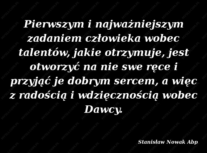 Pierwszym i najważniejszym zadaniem człowieka wobec talentów, jakie otrzymuje, jest otworzyć na nie swe ręce i przyjąć je dobrym sercem, a więc z radością i wdzięcznością wobec Dawcy.