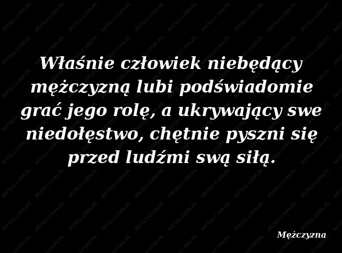 Właśnie człowiek niebędący mężczyzną lubi podświadomie grać jego rolę, a ukrywający swe niedołęstwo, chętnie pyszni się przed ludźmi swą siłą.