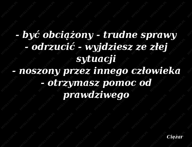- być obciążony - trudne sprawy - odrzucić - wyjdziesz ze złej sytuacji - noszony przez innego człowieka - otrzymasz pomoc od prawdziwego