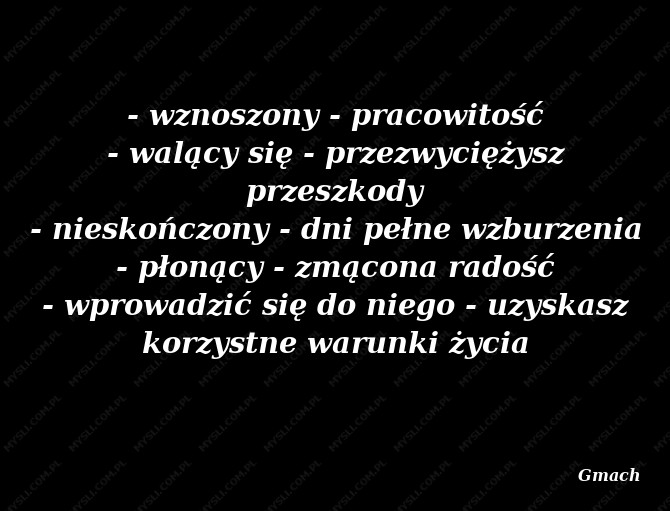 - wznoszony - pracowitość - walący się - przezwyciężysz przeszkody - nieskończony - dni pełne wzburzenia - płonący - zmącona radość - wprowadzić się do niego - uzyskasz korzystne warunki życia