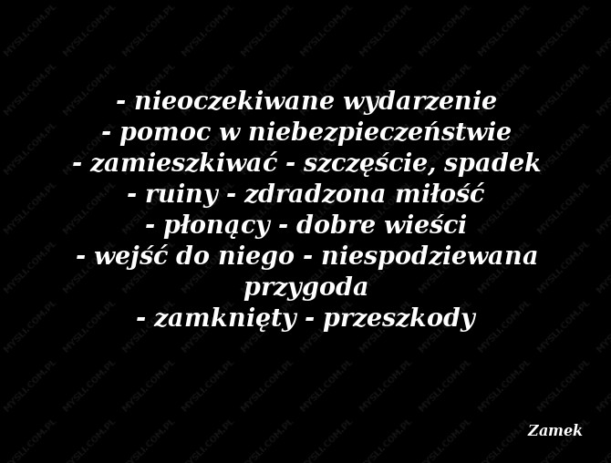 - nieoczekiwane wydarzenie - pomoc w niebezpieczeństwie - zamieszkiwać - szczęście, spadek - ruiny - zdradzona miłość - płonący - dobre wieści - wejść do niego - niespodziewana przygoda - zamknięty - przeszkody