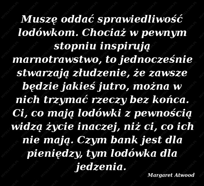 Muszę oddać sprawiedliwość lodówkom. Chociaż w pewnym stopniu inspirują marnotrawstwo, to jednocześnie stwarzają złudzenie, że zawsze będzie jakieś jutro, można w nich trzymać rzeczy bez końca. Ci, co mają lodówki z pewnością widzą życie inaczej, niż ci, co ich nie mają. Czym bank jest dla pieniędzy, tym lodówka dla jedzenia.