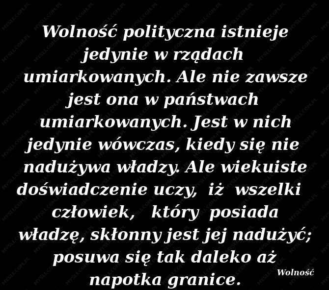 Wolność polityczna istnieje jedynie w rządach umiarkowanych. Ale nie zawsze jest ona w państwach umiarkowanych. Jest w nich jedynie wówczas, kiedy się nie nadużywa władzy. Ale wiekuiste doświadczenie uczy, iż wszelki człowiek, który posiada władzę, skłonny jest jej nadużyć; posuwa się tak daleko aż napotka granice.
