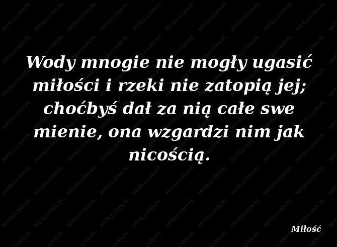 Wody mnogie nie mogły ugasić miłości i rzeki nie zatopią jej; choćbyś dał za nią całe swe mienie, ona wzgardzi nim jak nicością.