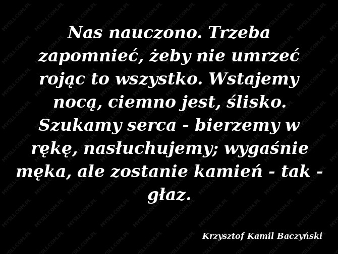 Nas nauczono. Trzeba zapomnieć, żeby nie umrzeć rojąc to wszystko. Wstajemy nocą, ciemno jest, ślisko. Szukamy serca - bierzemy w rękę, nasłuchujemy; wygaśnie męka, ale zostanie kamień - tak - głaz.