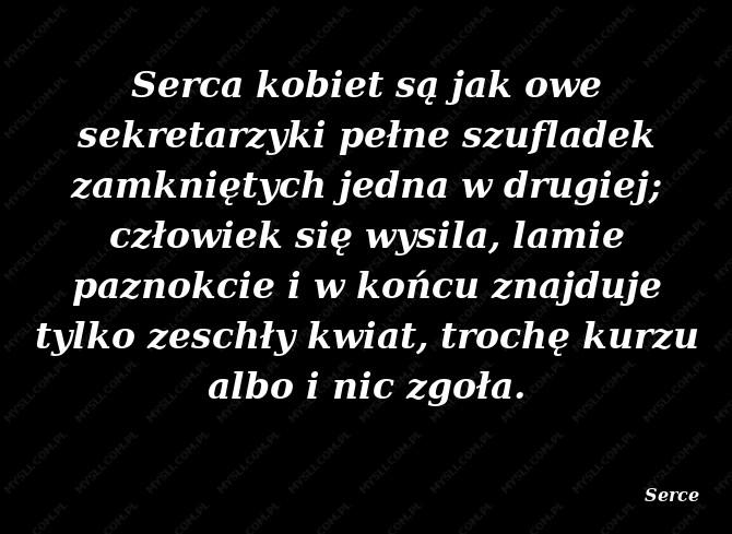 Serca kobiet są jak owe sekretarzyki pełne szufladek zamkniętych jedna w drugiej; człowiek się wysila, lamie paznokcie i w końcu znajduje tylko zeschły kwiat, trochę kurzu albo i nic zgoła.