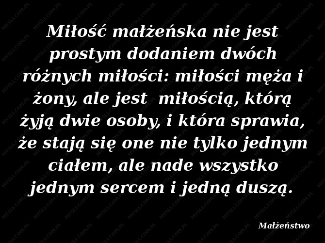Miłość małżeńska nie jest prostym dodaniem dwóch różnych miłości: miłości męża i żony, ale jest miłością, którą żyją dwie osoby, i która sprawia, że stają się one nie tylko jednym ciałem, ale nade wszystko jednym sercem i jedną duszą.