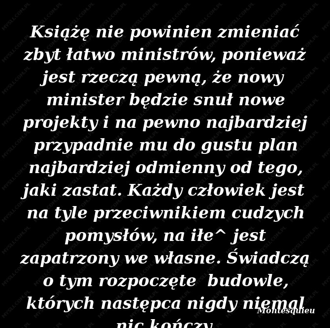 Książę nie powinien zmieniać zbyt łatwo ministrów, ponieważ jest rzeczą pewną, że nowy minister będzie snuł nowe projekty i na pewno najbardziej przypadnie mu do gustu plan najbardziej odmienny od tego, jaki zastat. Każdy człowiek jest na tyle przeciwnikiem cudzych pomysłów, na iłe^ jest zapatrzony we własne. Świadczą o tym rozpoczęte budowle, których następca nigdy niemal nic kończy.