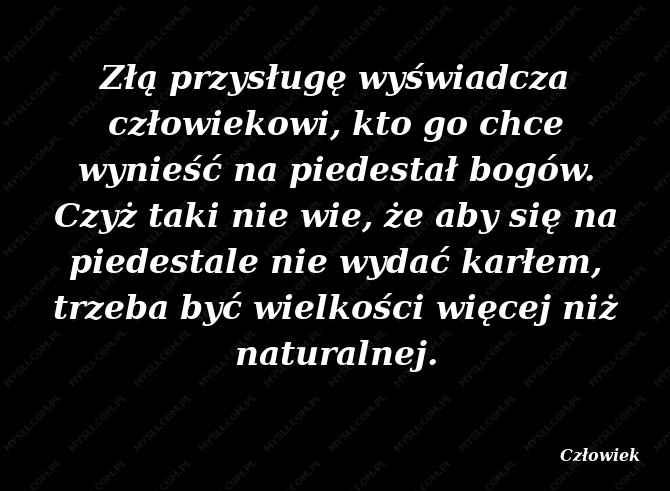 Złą przysługę wyświadcza człowiekowi, kto go chce wynieść na piedestał bogów. Czyż taki nie wie, że aby się na piedestale nie wydać karłem, trzeba być wielkości więcej niż naturalnej.