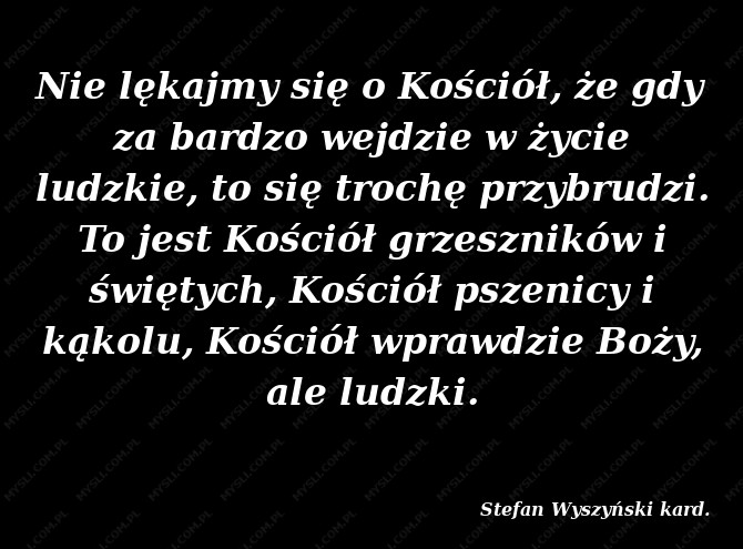 Nie lękajmy się o Kościół, że gdy za bardzo wejdzie w życie ludzkie, to się trochę przybrudzi. To jest Kościół grzeszników i świętych, Kościół pszenicy i kąkolu, Kościół wprawdzie Boży, ale ludzki.