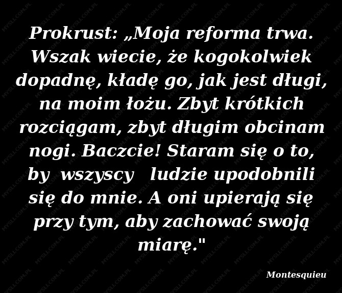 Prokrust: „Moja reforma trwa. Wszak wiecie, że kogokolwiek dopadnę, kładę go, jak jest długi, na moim łożu. Zbyt krótkich rozciągam, zbyt długim obcinam nogi. Baczcie! Staram się o to, by wszyscy ludzie upodobnili się do mnie. A oni upierają się przy tym, aby zachować swoją miarę."