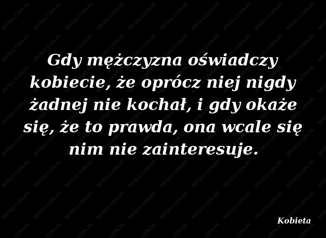 Gdy mężczyzna oświadczy kobiecie, że oprócz niej nigdy żadnej nie kochał, i gdy okaże się, że to prawda, ona wcale się nim nie zainteresuje.