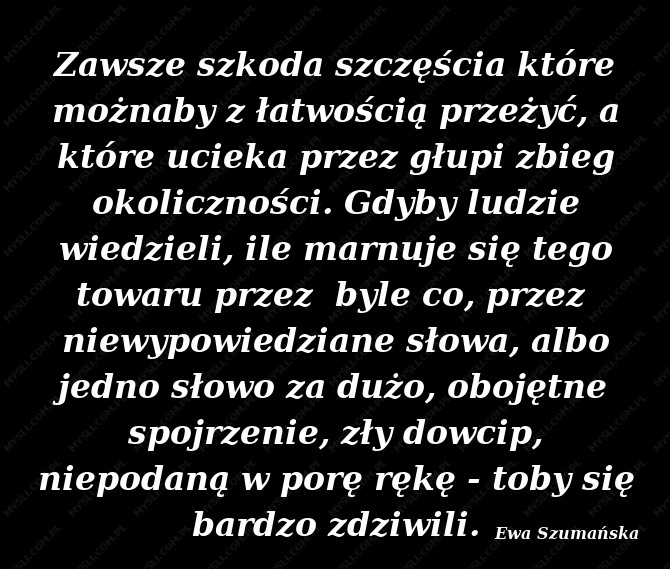 Zawsze szkoda szczęścia które możnaby z łatwością przeżyć, a które ucieka przez głupi zbieg okoliczności. Gdyby ludzie wiedzieli, ile marnuje się tego towaru przez byle co, przez niewypowiedziane słowa, albo jedno słowo za dużo, obojętne spojrzenie, zły dowcip, niepodaną w porę rękę - toby się bardzo zdziwili.