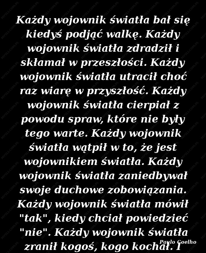 Każdy wojownik światła bał się kiedyś podjąć walkę. Każdy wojownik światła zdradził i skłamał w przeszłości. Każdy wojownik światła utracił choć raz wiarę w przyszłość. Każdy wojownik światła cierpiał z powodu spraw, które nie były tego warte. Każdy wojownik światła wątpił w to, że jest wojownikiem światła. Każdy wojownik światła zaniedbywał swoje duchowe zobowiązania. Każdy wojownik światła mówił "tak", kiedy chciał powiedzieć "nie". Każdy wojownik światła zranił kogoś, kogo kochał. I dlatego jest wojownikiem światła. Bowiem doświadczył tego wszystkiego i nie utracił nadziei, że stanie się lepszym człowiekiem.
